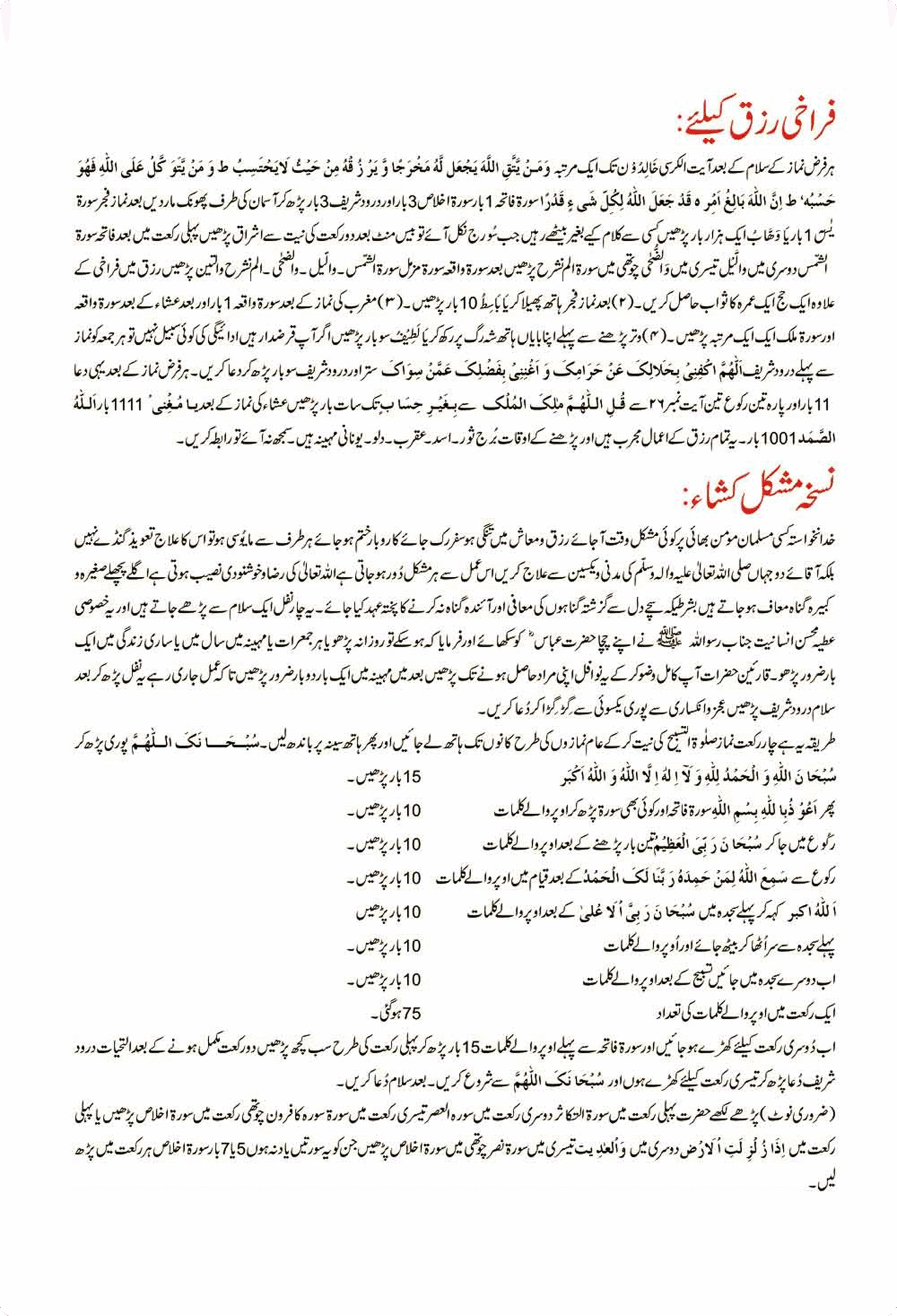 Recite Ayat ul Kursi, Surah Fatiha (1), Surah Ikhlas(3), Darood Sharif(3) after every Namaz. Recite Surah Yasin after Fajr Prayer. Offer Ishraq prayer after the sun rises. Recite Surah Al-Shams, Al-Lail, Al-Zuha and Alam Nashrah in four rakats after Surah Fatiha and pray one Surah in one rakat. Follow the sequence of Surahs in rakats.