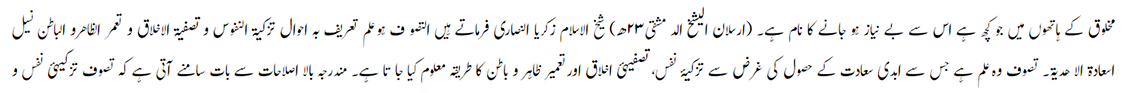 قلب و باطن کی صفا و جلد کا نام ہے۔جس کا خیر علوم قرآن و سنت نبوی سے اٹھا ہے۔ تصوف کا رشتہ عہد رسالت و عہد صحابہ سے استوار ہے۔ با لفاظ دیگر روح، تصوف اور اسکی عملی کیفیات حضور سر ور قلوب و اذہان کے دوربا.